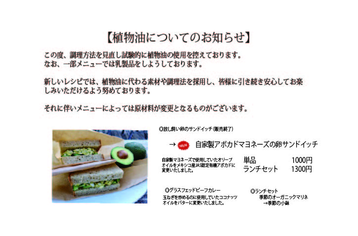 米粉パンのみ少量のココナッツオイルを使用しておりますが、それ以外での植物油の使用を見直しております。